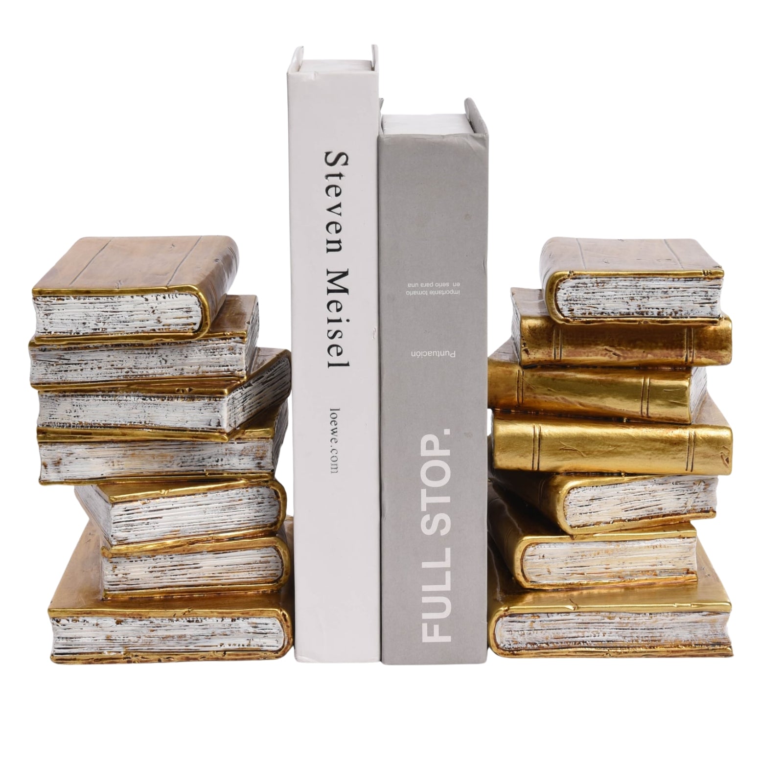 - Add a touch of elegance to your home or office with these stunning vintage-inspired bookends. Crafted to resemble stacks of antique books, these bookends feature a beautifully distressed finish with gold-accented edges, creating a luxurious, timeless look. Perfect for keeping your books in place while enhancing your space with a chic, eclectic vibe